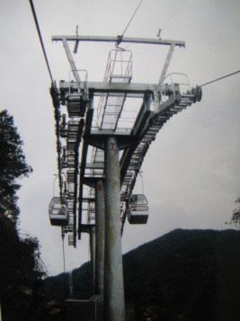2003年7月開工建設(shè),2004年4月竣工完成。索道型式為單線循環(huán)固定抱索器雙人吊廂式,線路水平距離2226.285米,高差1078.7米,單向小時運量300人。