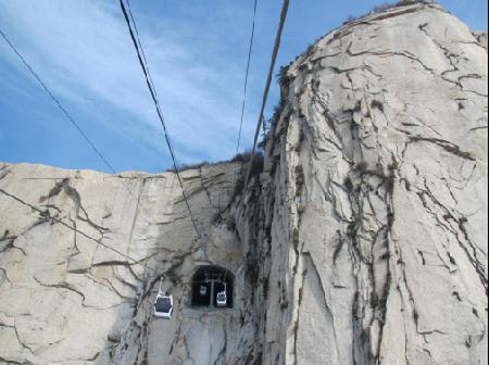 索道線路由兩段組成,既可分別獨立運行,又可通過中間站推車系統(tǒng)進行有效銜接,并成一條大索道整體運行。索道線路側型極為復雜,兩處爬坡角達到規(guī)范規(guī)定的上限值45°;索道運載索直徑達到56毫米,為我國現(xiàn)有索道中最粗的鋼絲繩;索道上站迂回輪張力和達到105噸;上站在西峰絕壁上鑿洞而建,在國內尚屬首例,在國外也不多見。因應地形條件,中間站采用地下車庫自動升降收發(fā)車系統(tǒng);采用三套水平救護系統(tǒng),可在極端情況下保證游客的安全。
