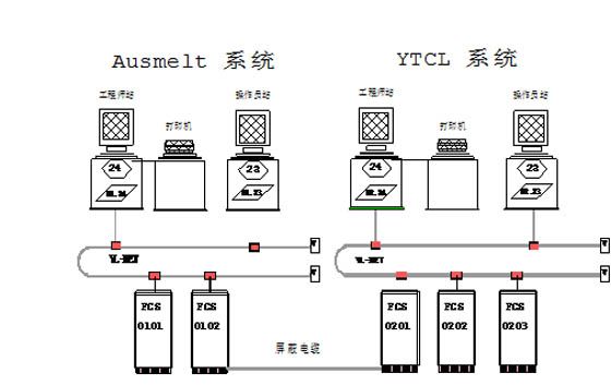根據全廠工藝控制的要求,熔煉DCS控制系統由Ausmelt系統及YTCL系統兩個獨立的CENTUM CS1000系統聯合構成。Ausmelt系統主要完成澳斯麥特爐部分的監測和控制。YTCL系統則完成澳斯麥特爐輔助部分及其它工藝流程的監測和控制。采用屏蔽電纜連接兩個系統的I/O卡件來完成點對點的數據通訊。