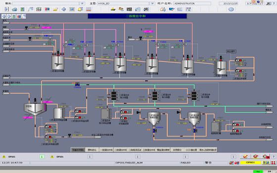 承擔該項目全廠自動化控制系統和工業電視監控系統的設計、供貨集成、施工安裝及調試的全流程服務。在調試過程中,由于原料不斷變化、工藝流程不成熟,還沒有投產就開始了改造。中國恩菲快速響應,幾乎在業主完成工藝改造的同時完成了組態畫面和控制邏輯的相應修改,保證了業主試生產的順利進行,得到業主充分認可。